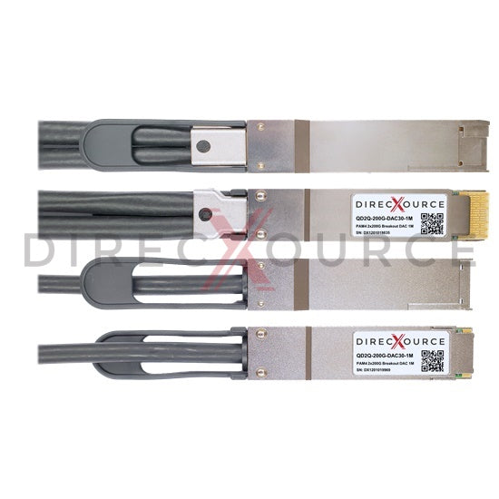 direcXource's QD2Q-200G-DAC30-1M DAC is a passive 2x 200Gbps QSFP-DD to 2 QSFP56 direct attach breakout cable for use in 200GBASE Ethernet. QSFP-DD breakout DAC provides 2x 200Gb/s throughput for 1m interconnection with high speed twin-axial copper cable. Standard length options cover from 0.5 meters to 2.5 meters. The breakout DAC cable splits 2x 200 Gbps PAM4 signals from QSFP-DD into QSFP56. It also supports 2x 100 Gbps NRZ fanout application. This DAC is fully compliant with QSFP-DD Multi-Source Agreement (MSA), IEEE 802.3cd 200GBASE-CR4 and 200GAUI-4 standard. The twin-axial copper cable's wire gauge is 30AWG and pre-terminated with MSA compliant 76-pin edge type connectors. MSA memory map are accessible via 2-wire Interface (TWI/I2C). Our breakout DACs are factory pre-programmed for compatibility, perform identically to generic MSA direct attach cables.
